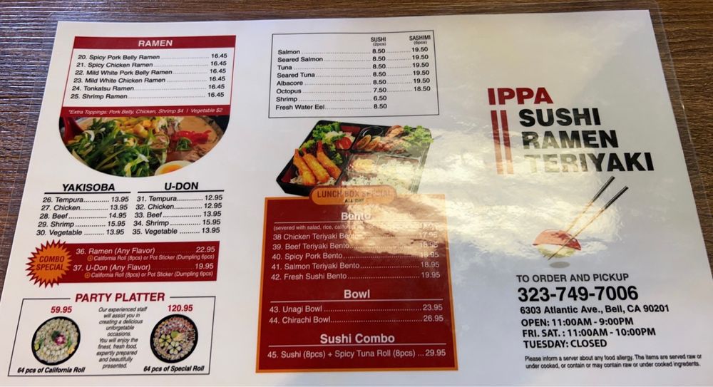 Welcome to IPPA Sushi Ramen, a delightful fusion of Asian flavors in Bell, CA. This casual dining spot offers a variety of ramen dishes, sushi rolls, and appetizers that cater to every palate. The menu includes unique combos like the Kitty Combo Chicken Teriyaki Plate and the Naruto Ramen Combo. IPPA Sushi Ramen also provides options for vegetarians and offers delivery and takeout services for convenience.